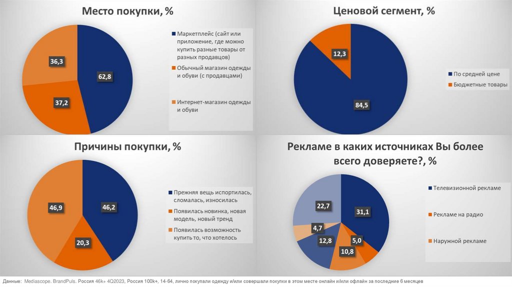 Данные: Mediascope. BrandPuls. Россия 46k+ 4Q2023, Россия 100k+, 14-64, лично покупали одежду и/или совершали покупки в этом месте онлайн и/или офлайн за последние 6 месяцев5.
