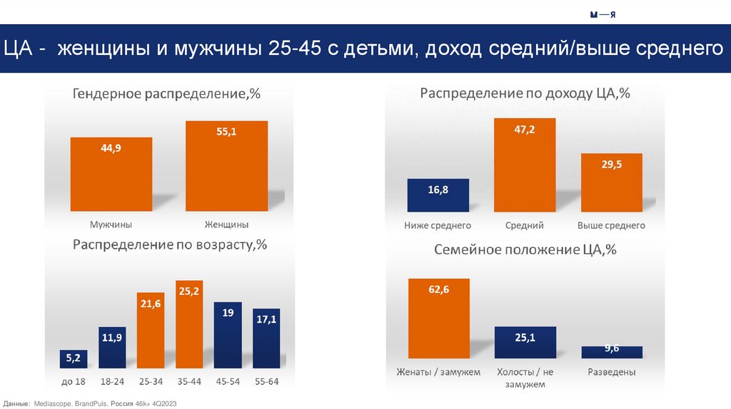 ЦА - женщины и мужчины 25-45 с детьми, доход средний/выше среднегоДанные: Mediascope. BrandPuls. Россия 46k+ 4Q2023