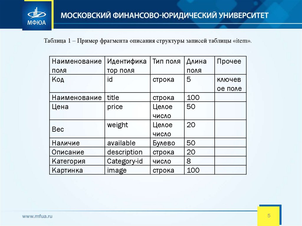 Таблица 1 – Пример фрагмента описания структуры записей таблицы «item».Наименование Идентифика Тип поля Длина