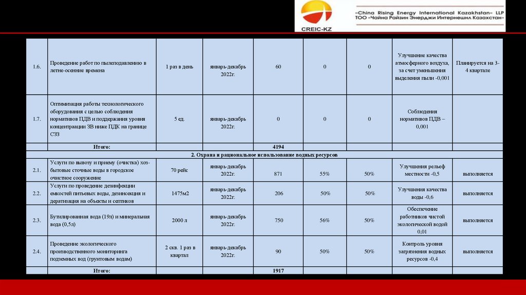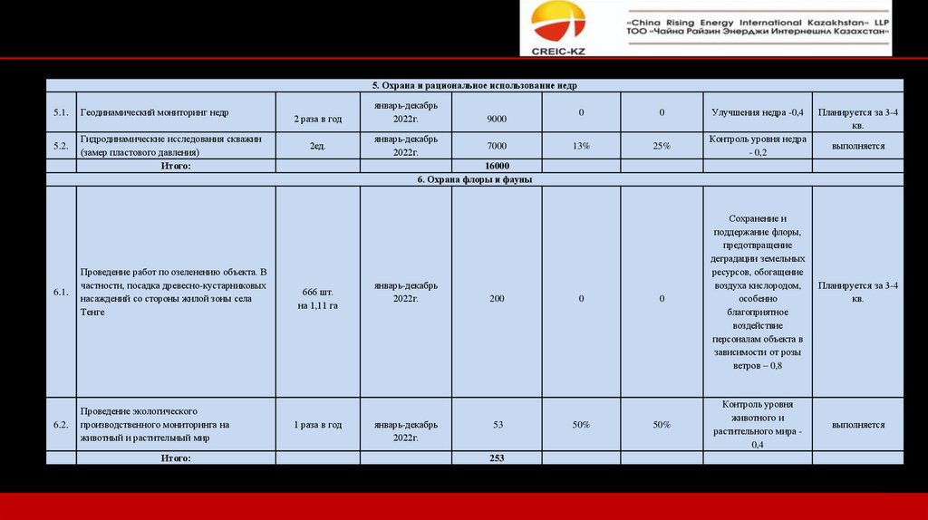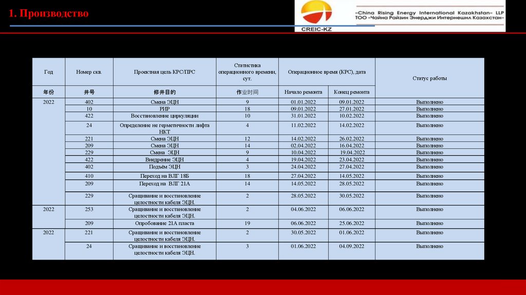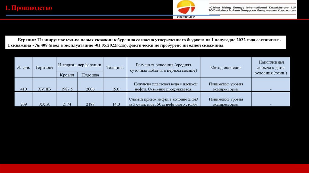 Бурение: Планируемое кол-во новых скважин к бурению согласно утвержденного бюджета на I полугодие 2022 года составляет 1 скважина - № 408 (ввод в эксплуатацию -01.05.2022года), фактически не пробурено ни одной скважины.