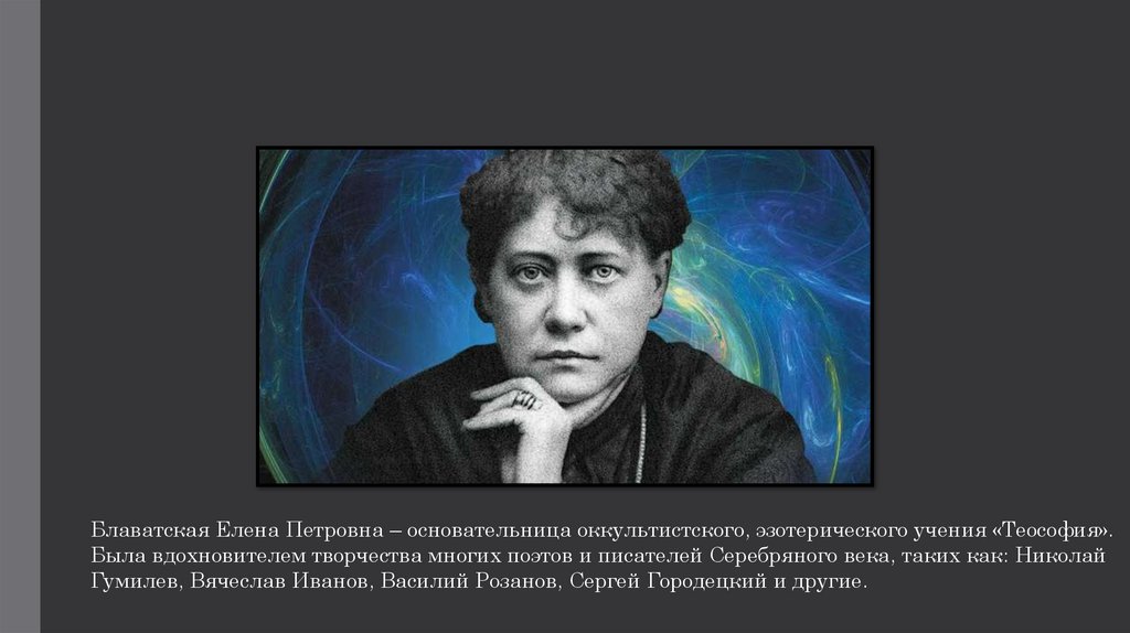 Блаватская Елена Петровна – основательница оккультистского, эзотерического учения «Теософия».Была вдохновителем творчества многих поэтов и писателей Серебряного века, таких как: Николай