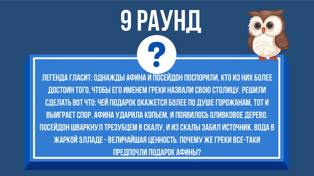 9 раундЛегенда гласит: однажды Афина и Посейдон поспорили, кто из них более