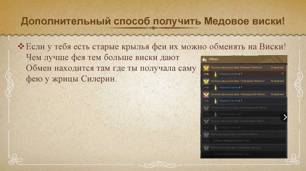 Дополнительный способ получить Медовое виски!Если у тебя есть старые крылья феи их можно обменять на Виски!