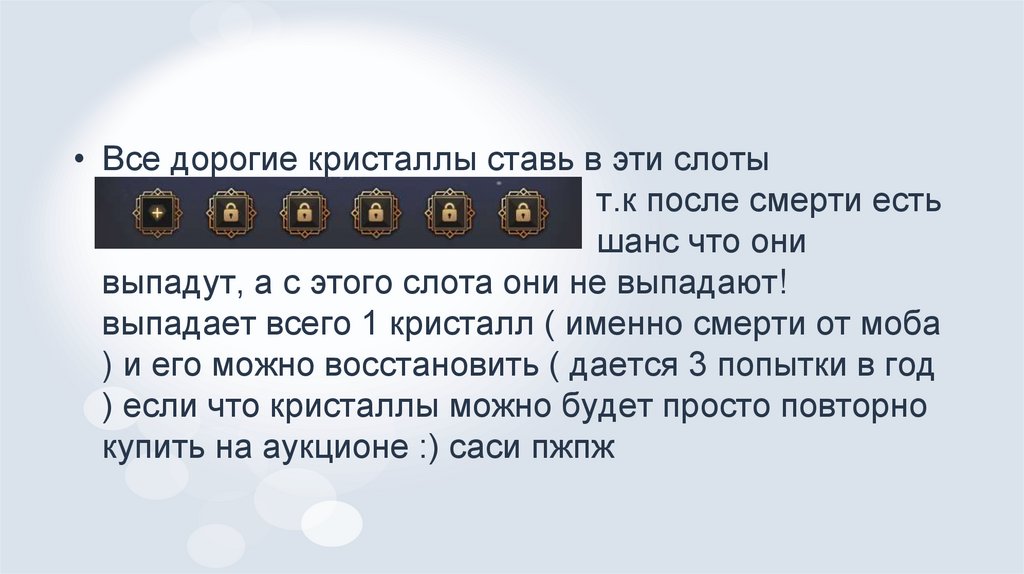 • Все дорогие кристаллы ставь в эти слотыт.к после смерти есть