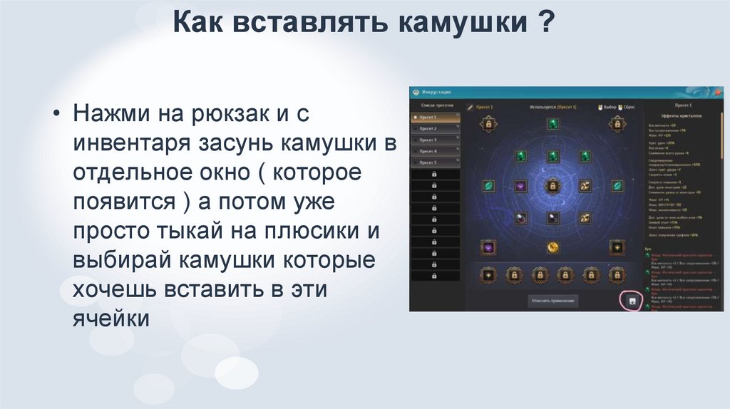 Как вставлять камушки ?• Нажми на рюкзак и с