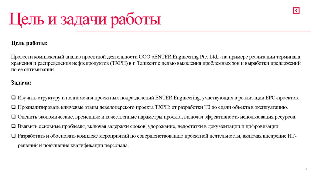 Провести комплексный анализ проектной деятельности ООО «ENTER Engineering Pte. Ltd.» на примере реализации терминала