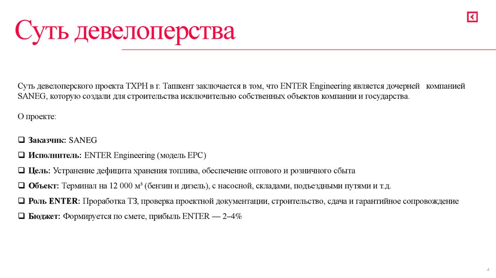 Суть девелоперстваСуть девелоперского проекта ТХРН в г. Ташкент заключается в том, что ENTER Engineering является дочерней компанией