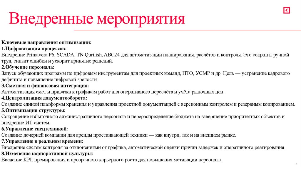 Внедрение Primavera P6, SCADA, TN Qurilish, ABC24 для автоматизации планирования, расчётов и контроля. Это сократит ручной