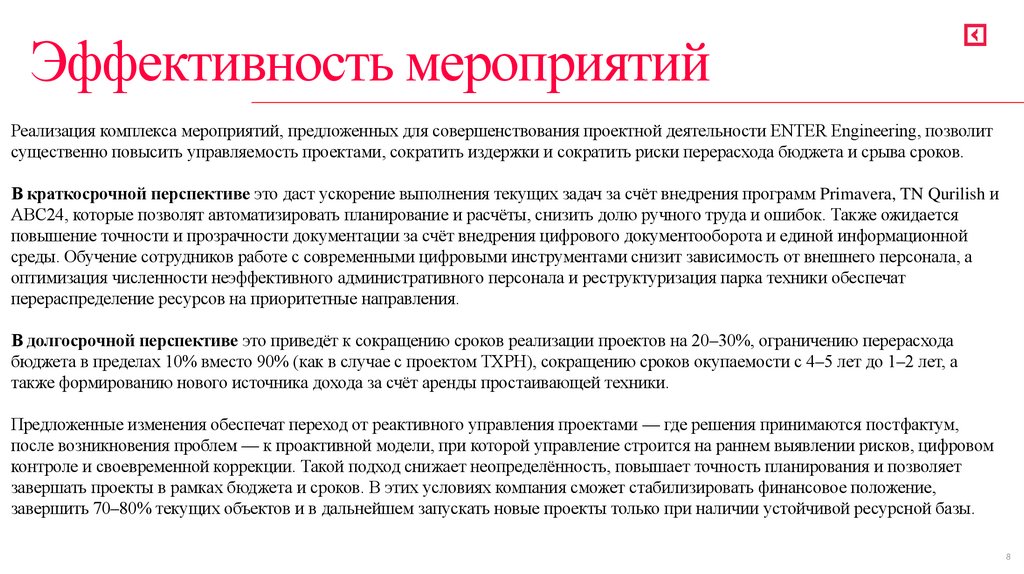 Эффективность мероприятийРеализация комплекса мероприятий, предложенных для совершенствования проектной деятельности ENTER Engineering, позволит