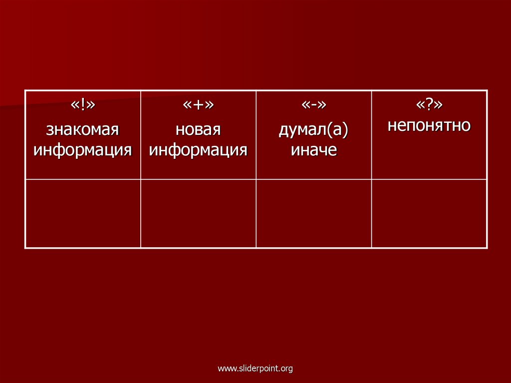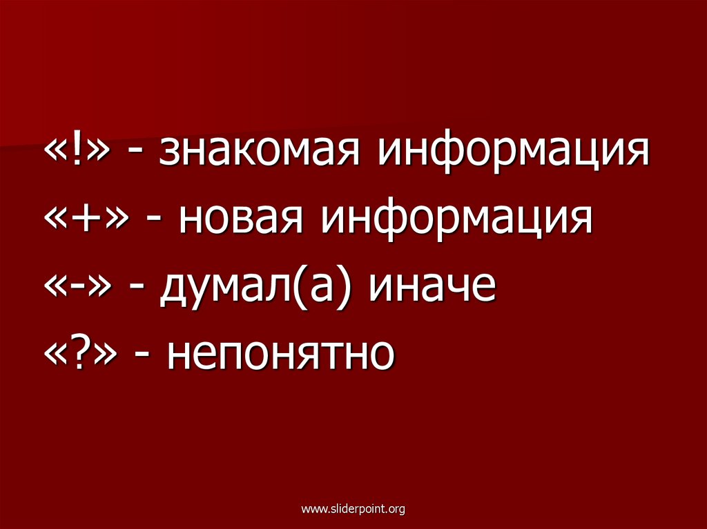 «!» - знакомая информация«+» - новая информация