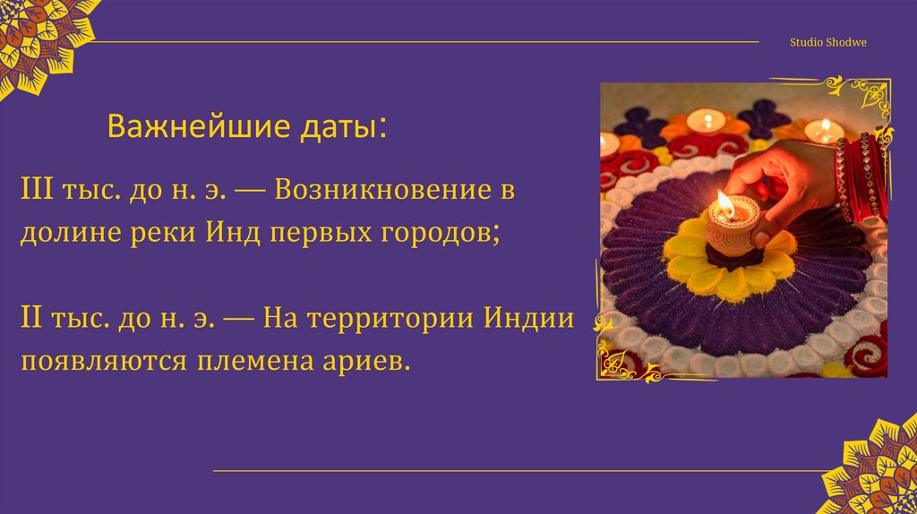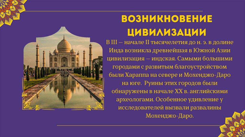 В III — начале II тысячелетия до н. э. в долинеИнда возникла древнейшая в Южной Азии