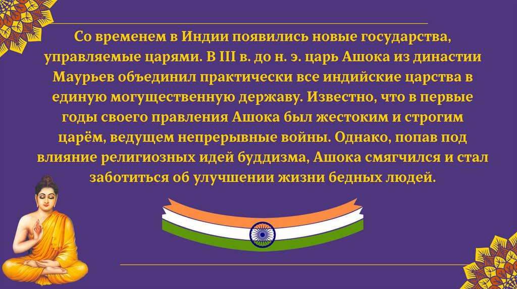 Со временем в Индии появились новые государства,управляемые царями. В III в. до н. э. царь Ашока из династии