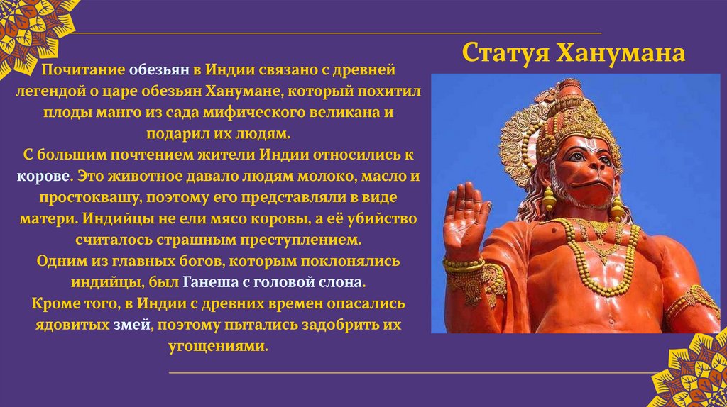 Почитание обезьян в Индии связано с древнейлегендой о царе обезьян Ханумане, который похитил