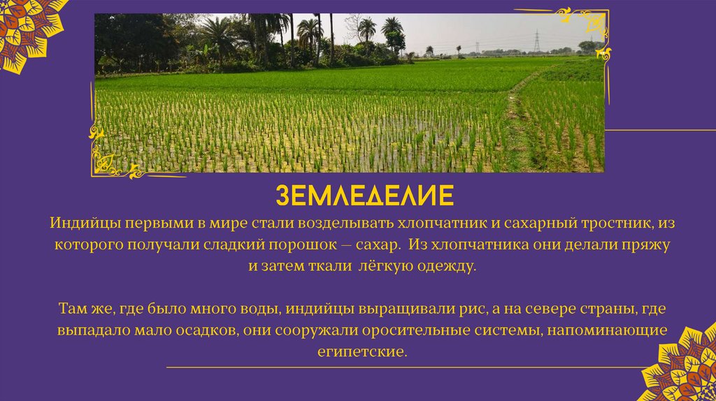 Индийцы первыми в мире стали возделывать хлопчатник и сахарный тростник, изкоторого получали сладкий порошок — сахар. Из хлопчатника они делали пряжу