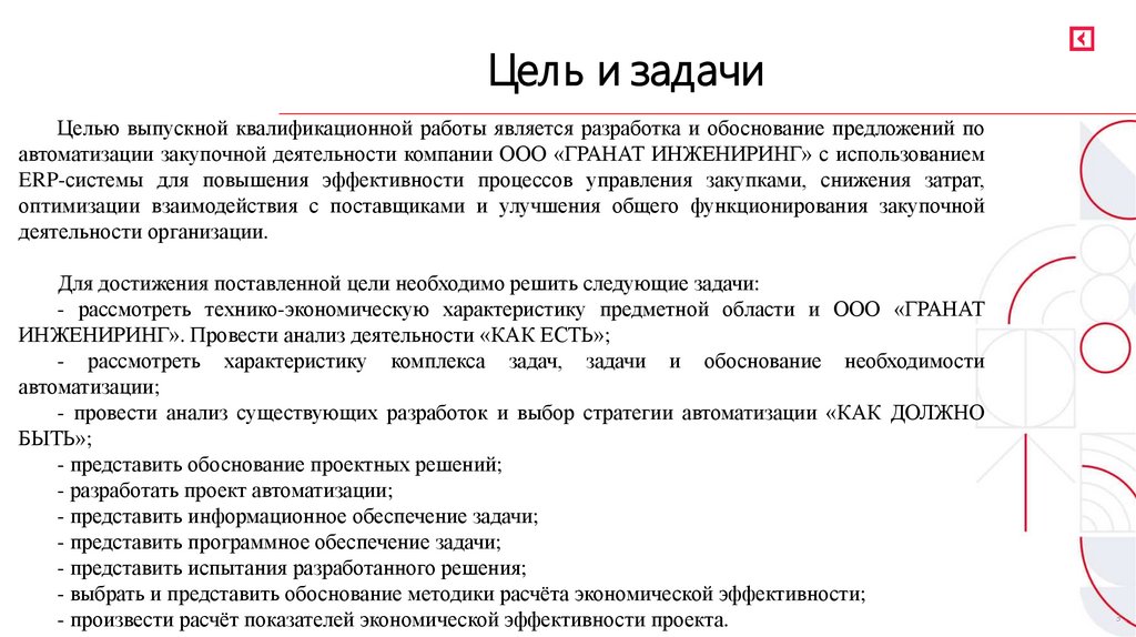 Цель и задачиЦелью выпускной квалификационной работы является разработка и обоснование предложений по