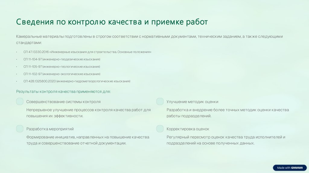 Сведения по контрол ю качества и приемке работКамеральные материалы подготовлены в строгом соответствии с нормативными документами, техническим заданием, а также следующими