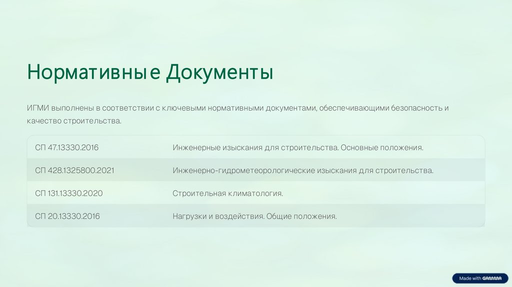 Нормативны е ДокументыИГМИ выполнены в соответствии с ключевыми нормативными документами, обеспечивающими безопасность и