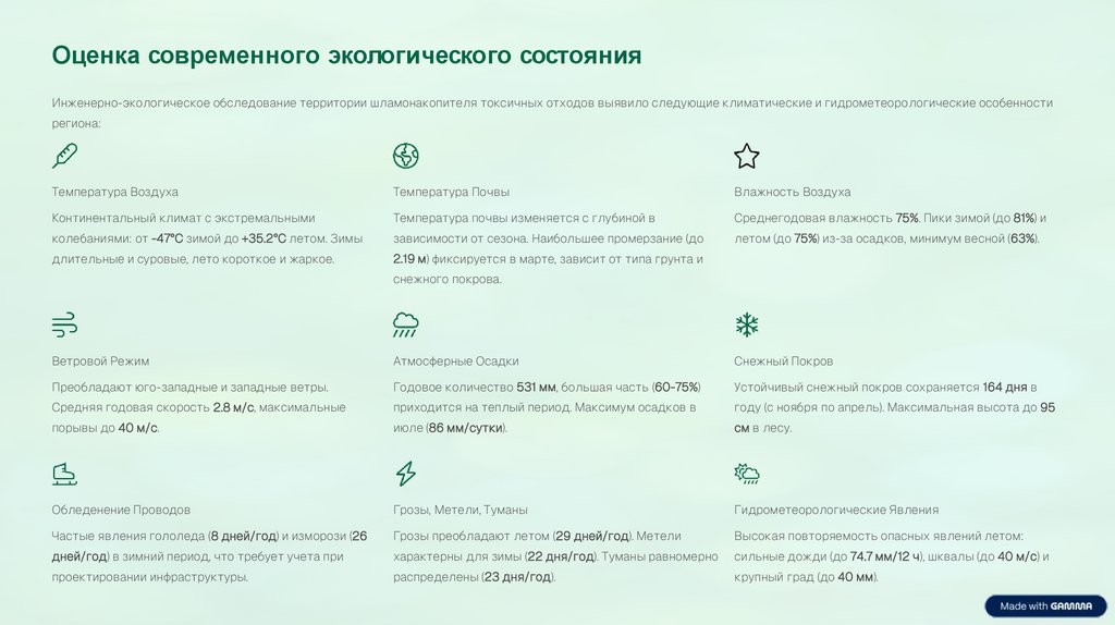 Оценка современного экологического состоянияИнженерно-экологическое обследование территории шламонакопителя токсичных отходов выявило следующие климатические и гидрометеорологические особенности