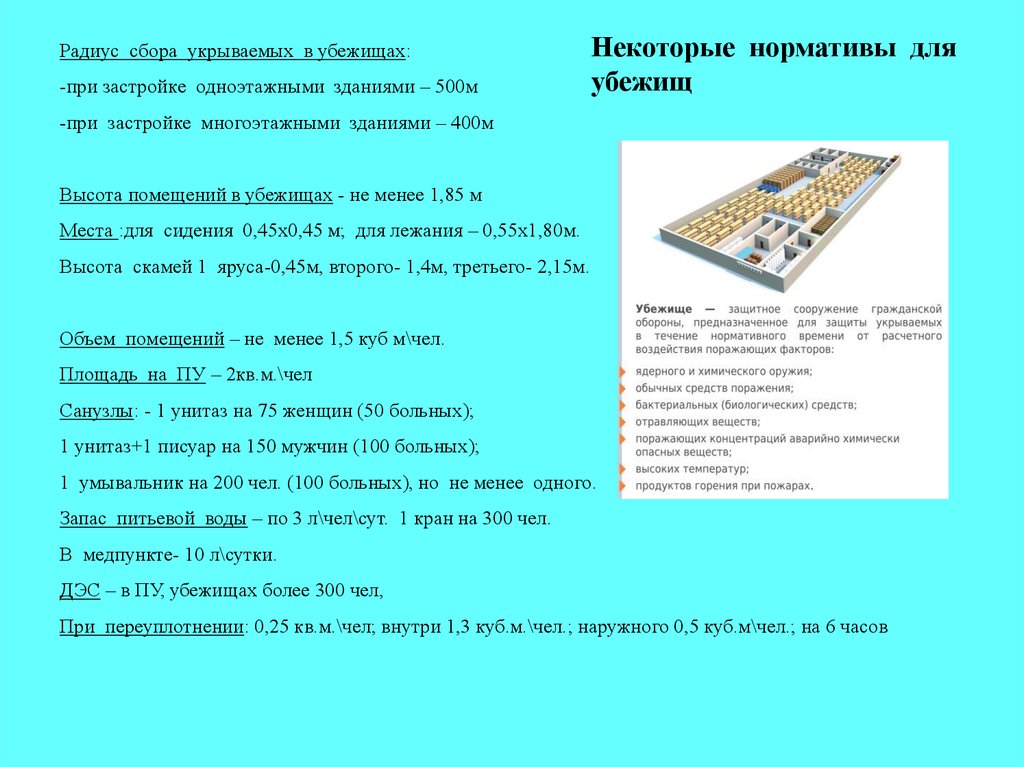 При переуплотнении: 0,25 кв.м.\чел; внутри 1,3 куб.м.\чел.; наружного 0,5 куб.м\чел.; на 6 часов