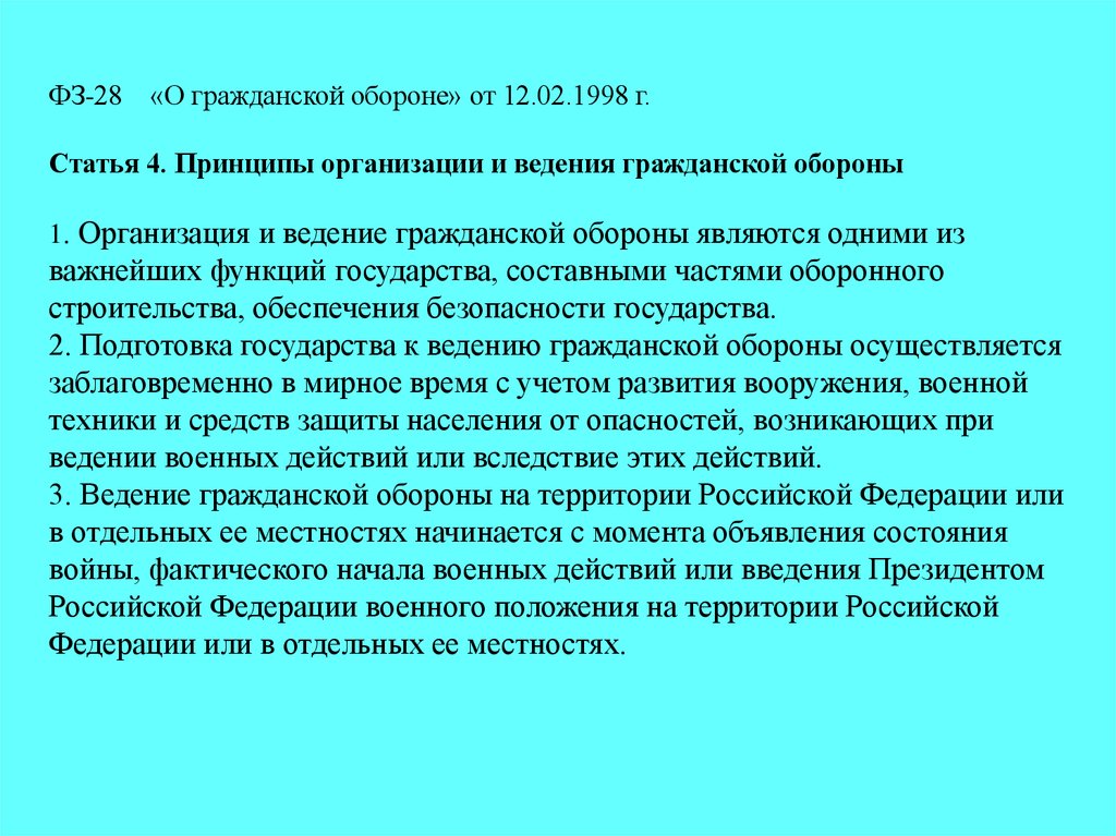 ФЗ-28 «О гражданской обороне» от 12.02.1998 г.Статья 4. Принципы организации и ведения гражданской обороны