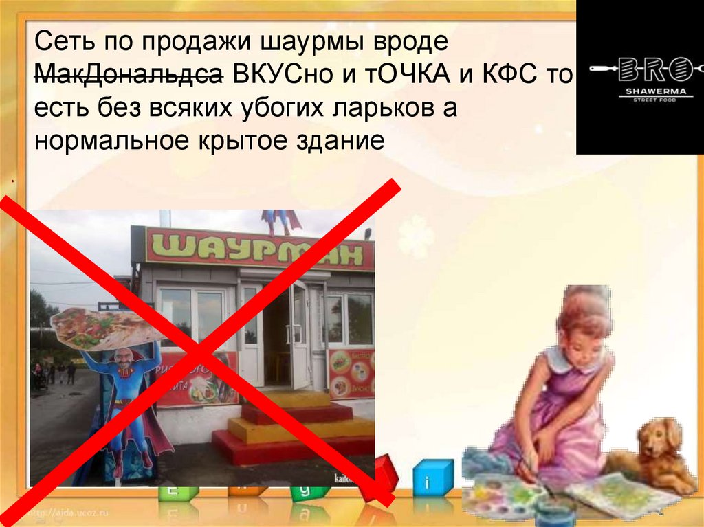 Сеть по продажи шаурмы вродеМакДональдса ВКУСно и тОЧКА и КФС то