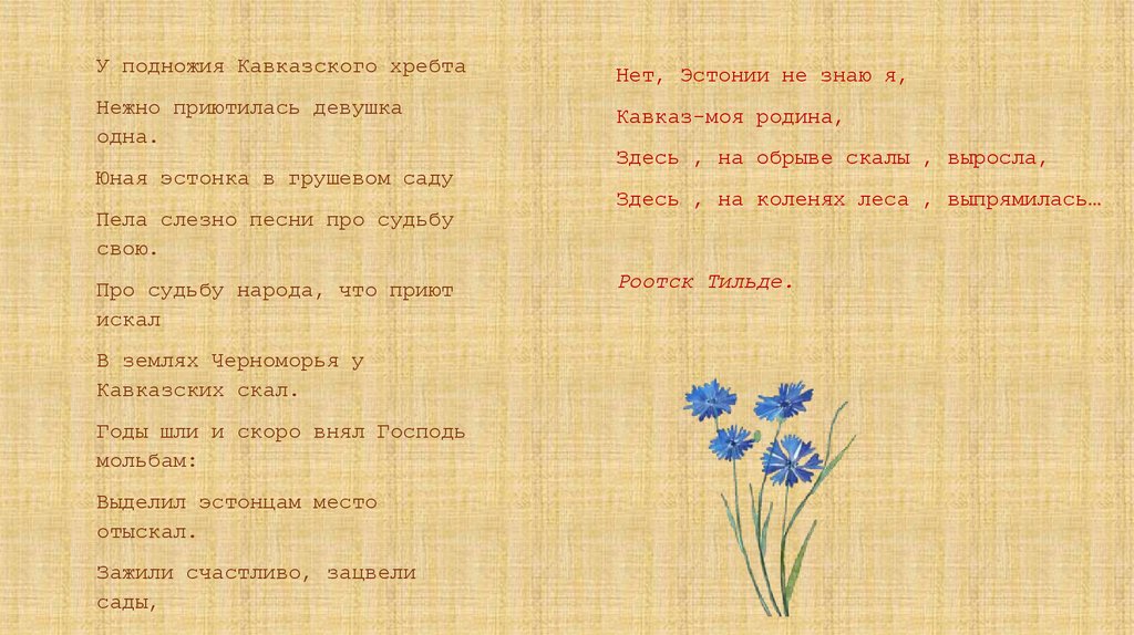 У подножия Кавказского хребтаНет, Эстонии не знаю я,