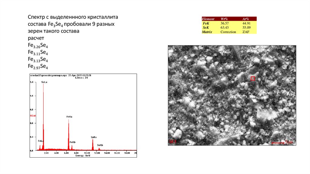 Спектр с выделеннного кристаллитасостава Fe3Se4 пробовали 9 разных