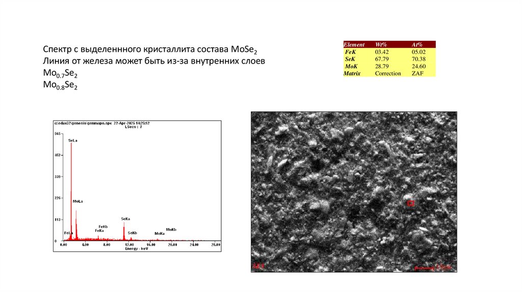 Спектр с выделеннного кристаллита состава MoSe2Линия от железа может быть из-за внутренних слоев