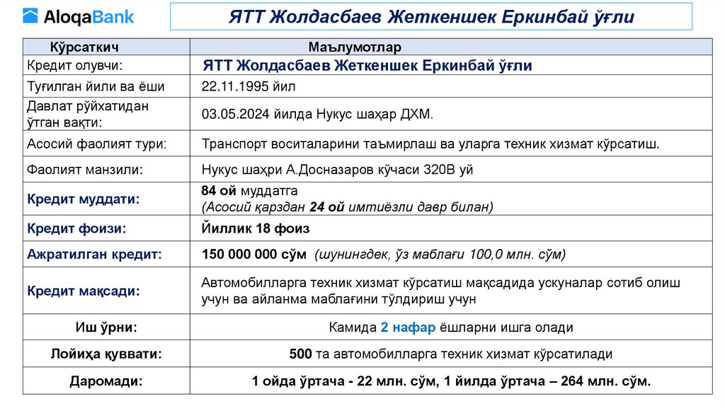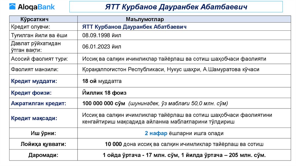 (Асосий қарздан 24 ой имтиёзли давр билан)