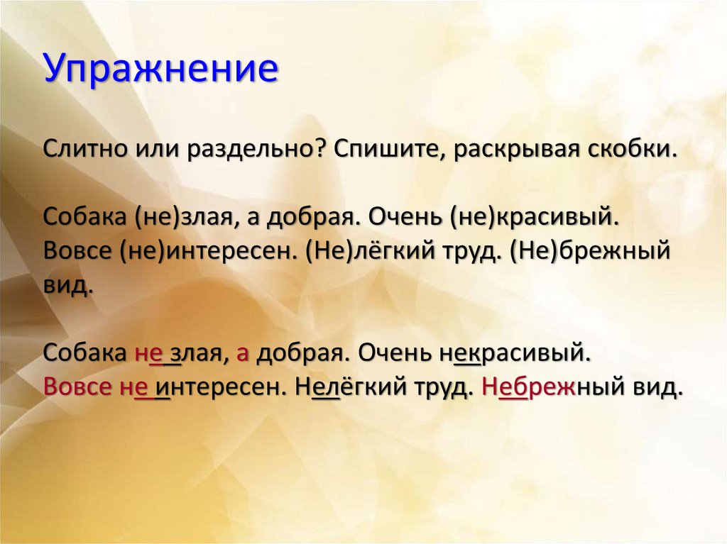 Вовсе (не)интересен. (Не)лёгкий труд. (Не)брежный