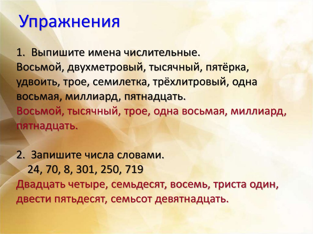 1. Выпишите имена числительные.Восьмой, двухметровый, тысячный, пятёрка,