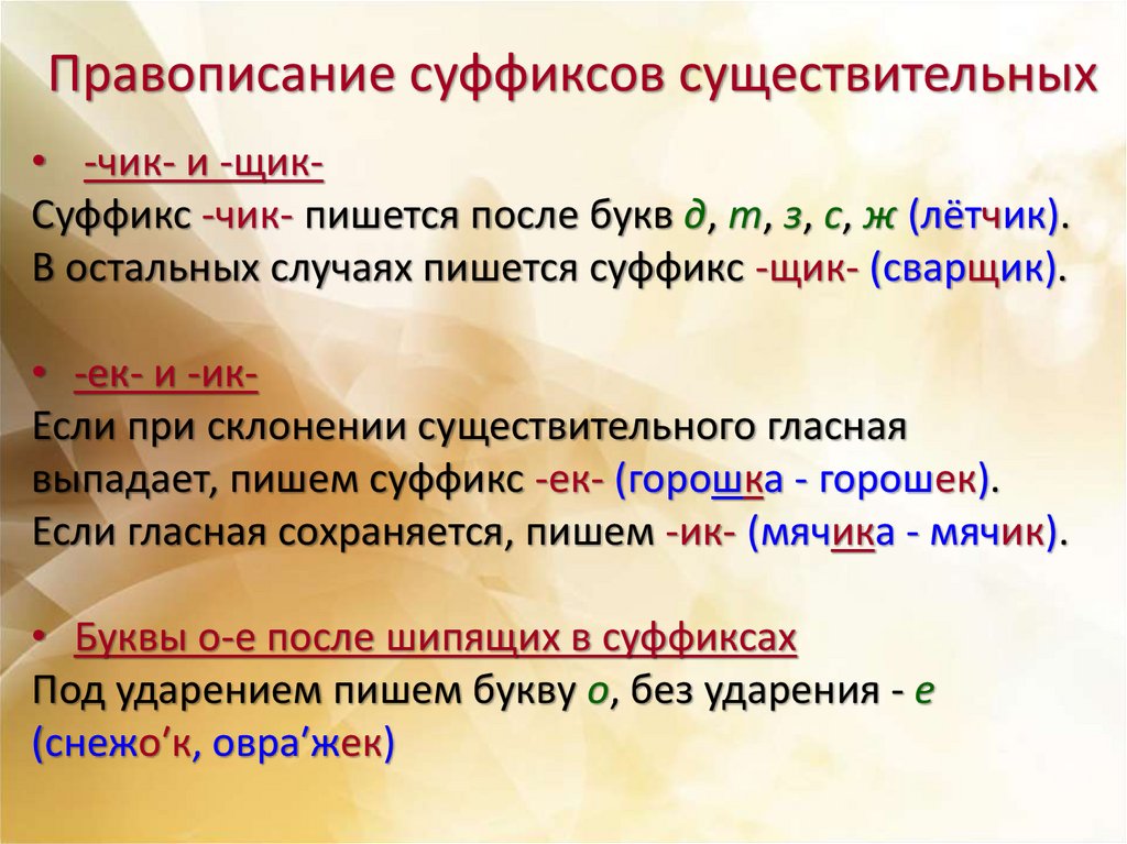 • -чик- и -щикСуффикс -чик- пишется после букв д, т, з, с, ж (лётчик).В остальных случаях пишется суффикс -щик- (сварщик).