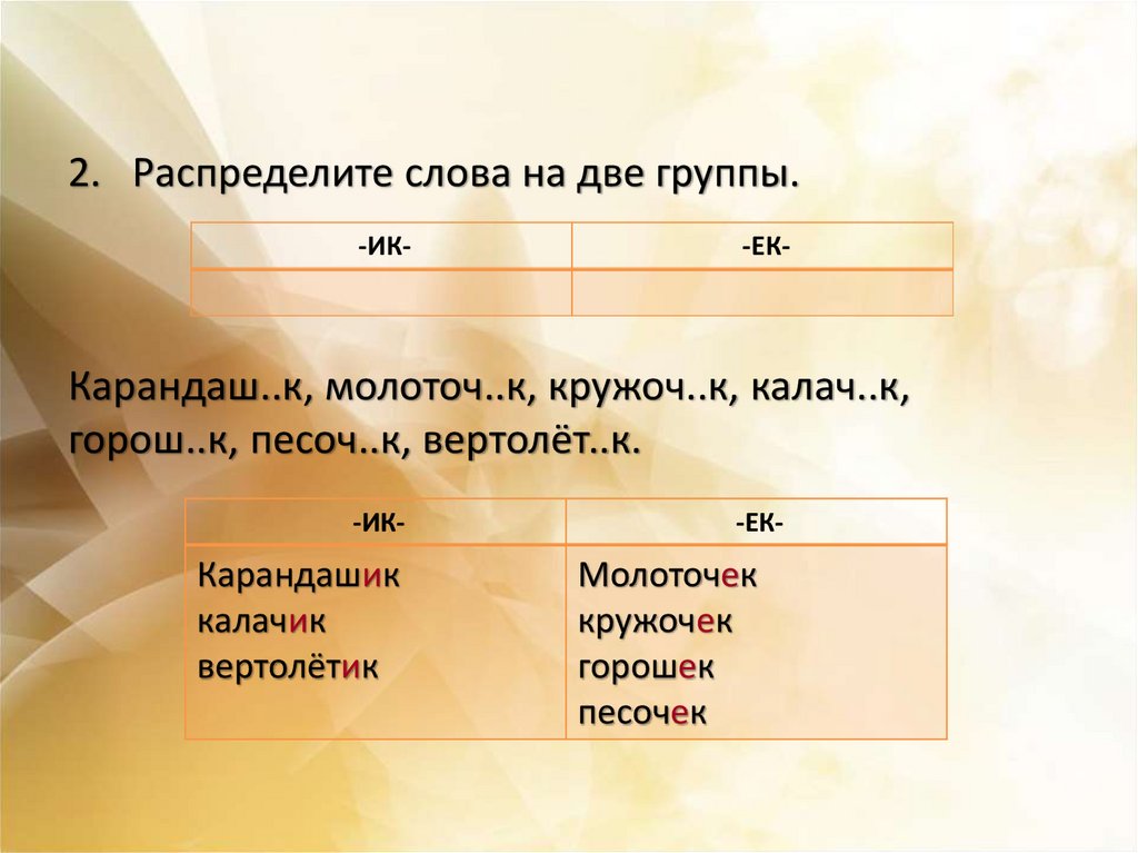 2. Распределите слова на две группы.Карандаш..к, молоточ..к, кружоч..к, калач..к,