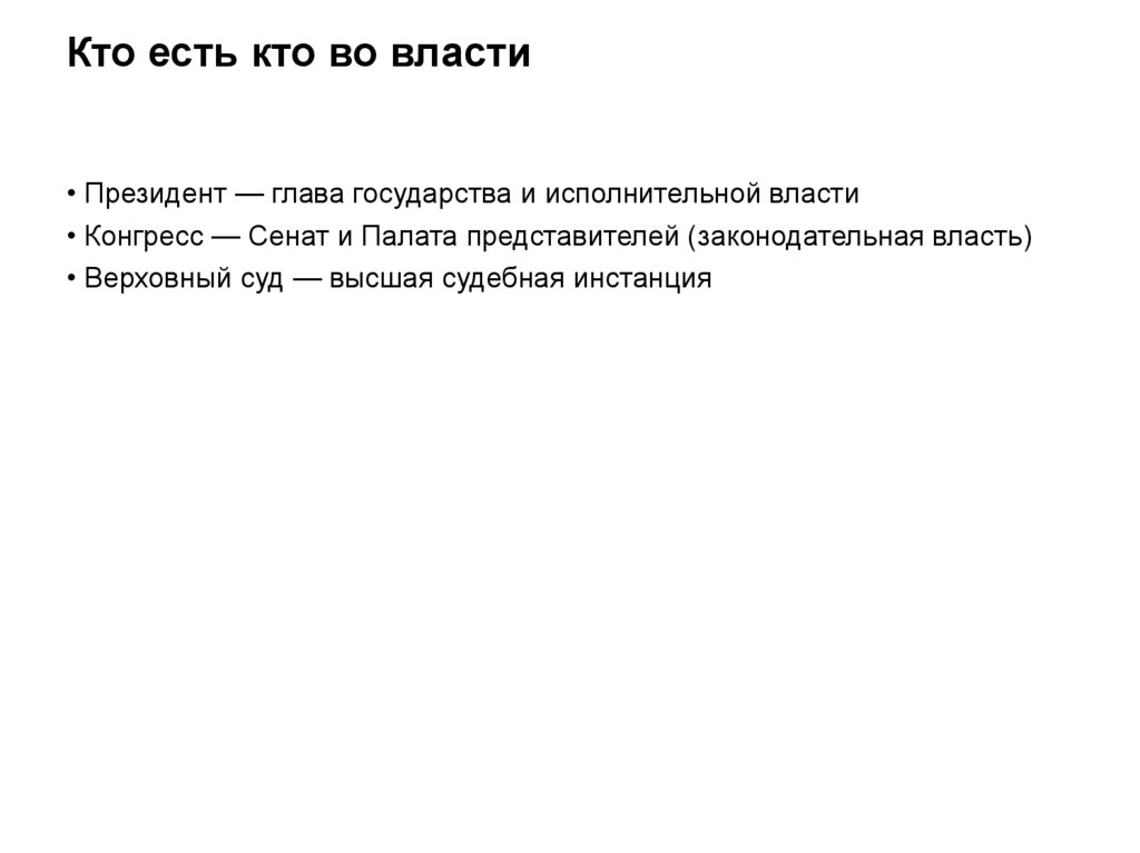 • Конгресс — Сенат и Палата представителей (законодательная власть)