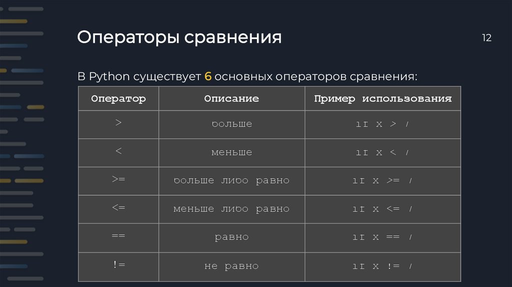 Операторы сравненияДля проверки условия мы используем специальный символ: