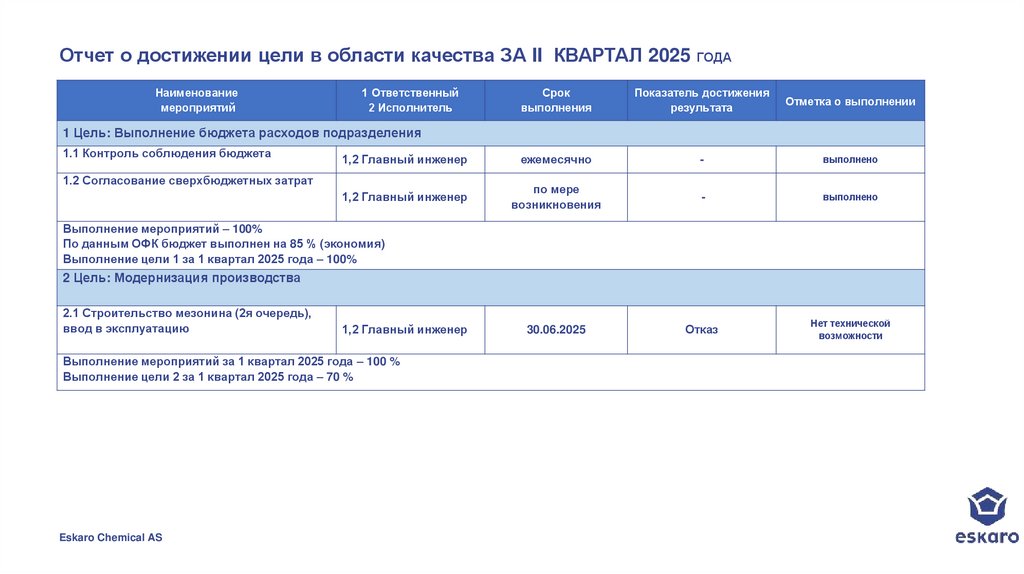 Отчет о достижении цели в области качества ЗА II КВАРТАЛ 2025 ГОДАНаименование