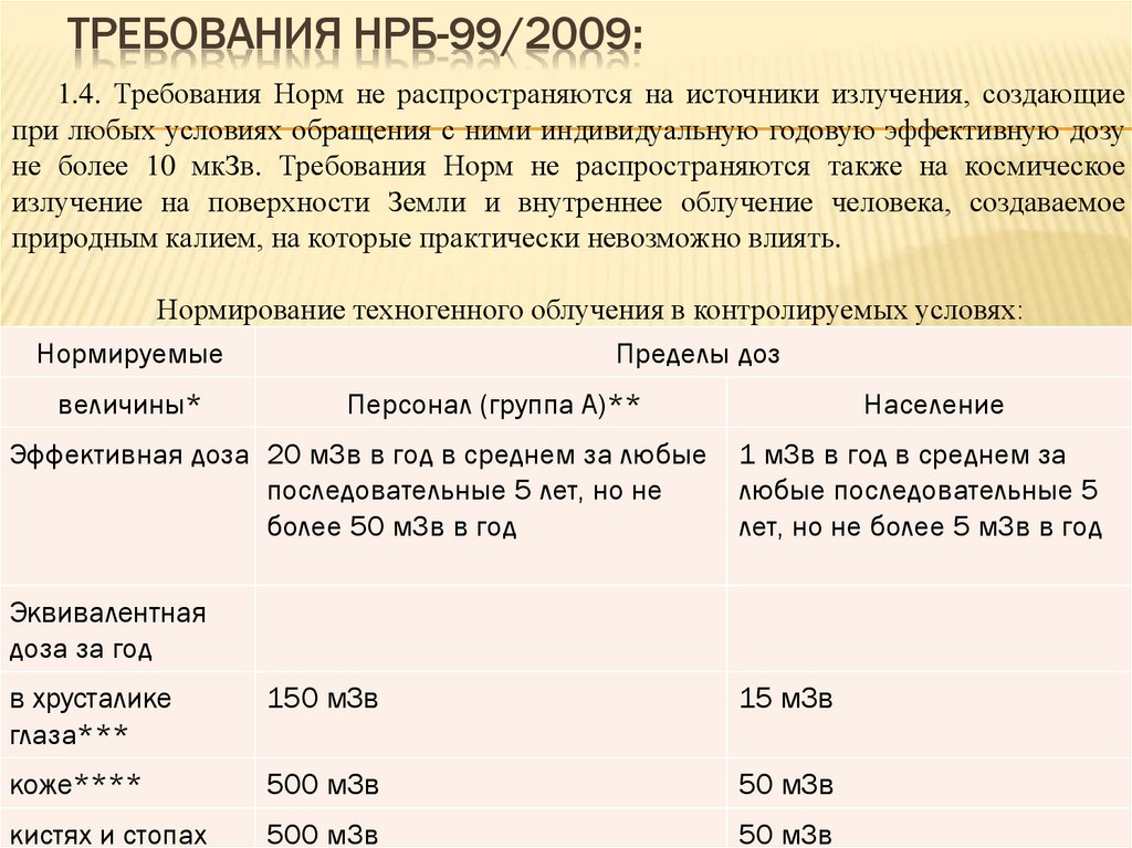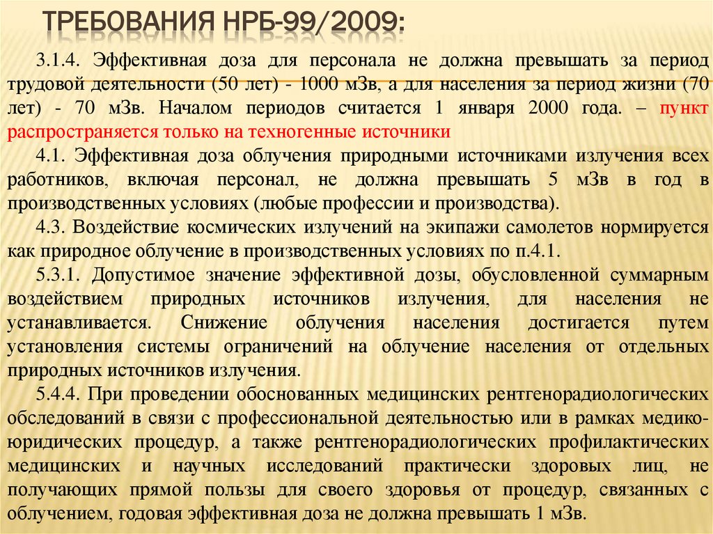 ТРЕБОВАНИЯ НРБ-99/2009:3.1.4. Эффективная доза для персонала не должна превышать за период