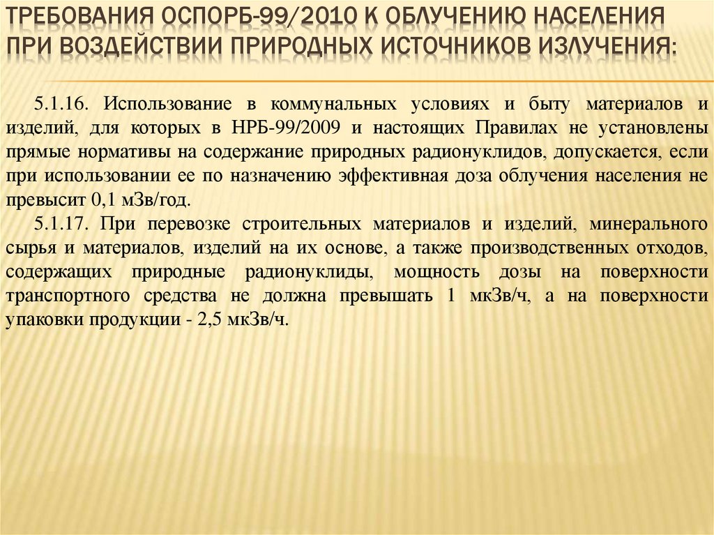 ТРЕБОВАНИЯ ОСПОРБ-99/2010 К ОБЛУЧЕНИЮ НАСЕЛЕНИЯПРИ ВОЗДЕЙСТВИИ ПРИРОДНЫХ ИСТОЧНИКОВ ИЗЛУЧЕНИЯ: