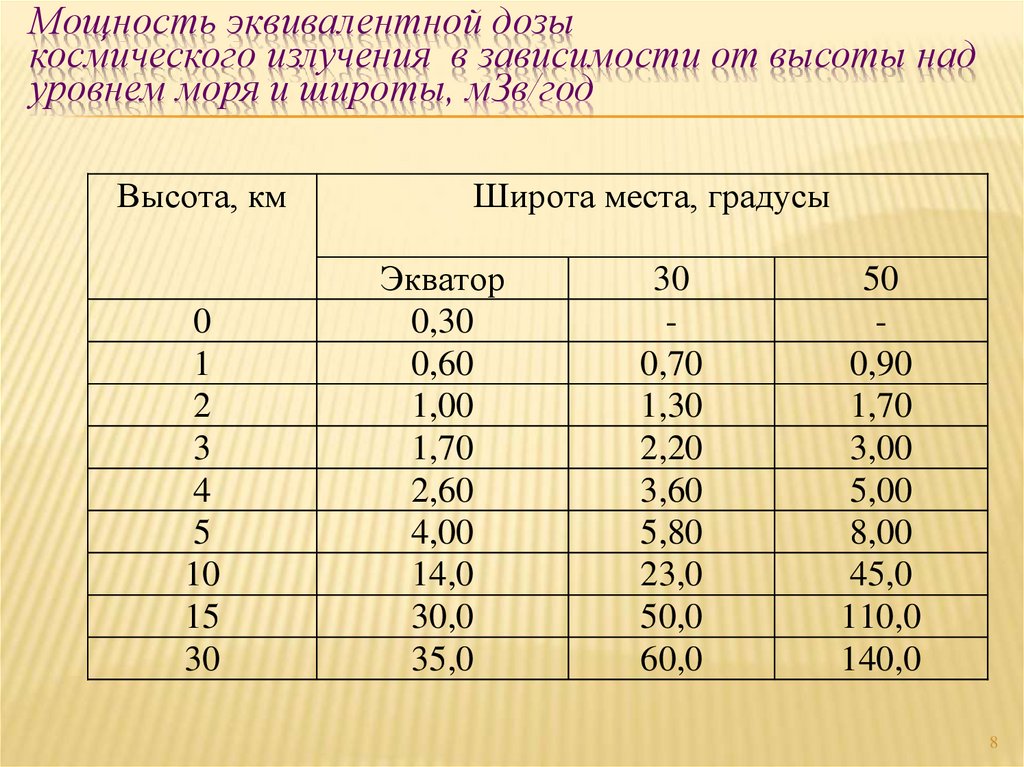 8. Мощность эквивалентной дозы космического излучения в зависимости от высоты над уровнем моря и широты, мЗв/год