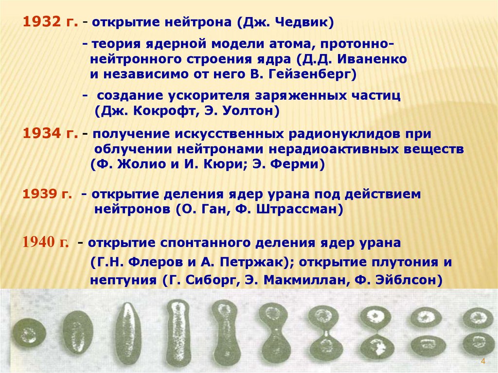 1932 г. - открытие нейтрона (Дж. Чедвик)- теория ядерной модели атома, протоннонейтронного строения ядра (Д.Д. Иваненко