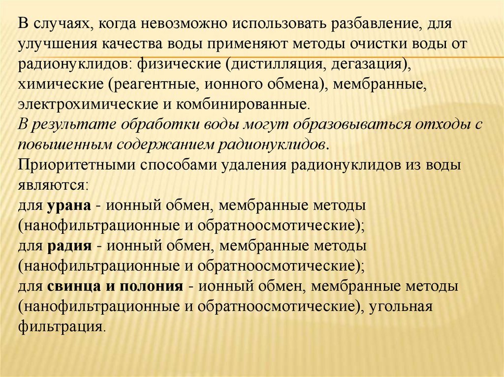 В случаях, когда невозможно использовать разбавление, дляулучшения качества воды применяют методы очистки воды от