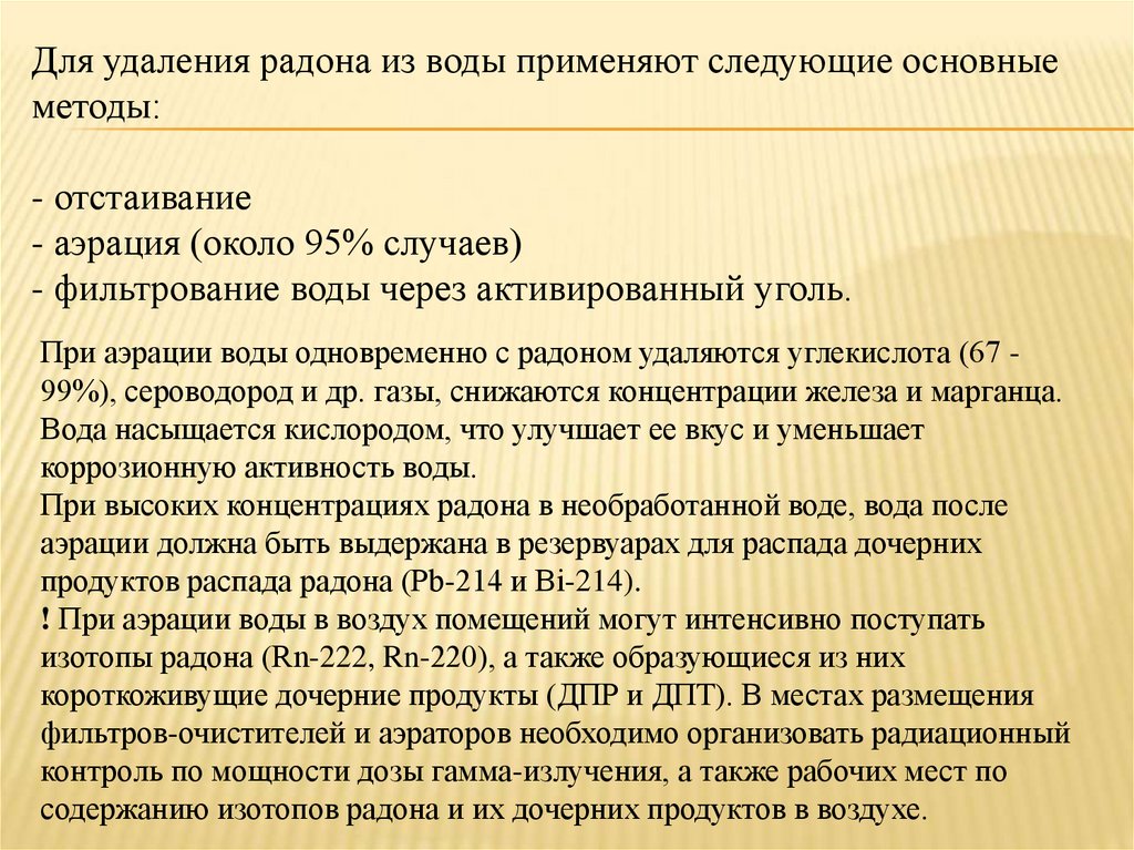При аэрации воды одновременно с радоном удаляются углекислота (67 99%), сероводород и др. газы, снижаются концентрации железа и марганца.