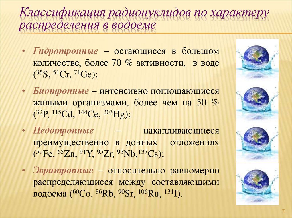 67. Классификация радионуклидов по характеру распределения в водоеме