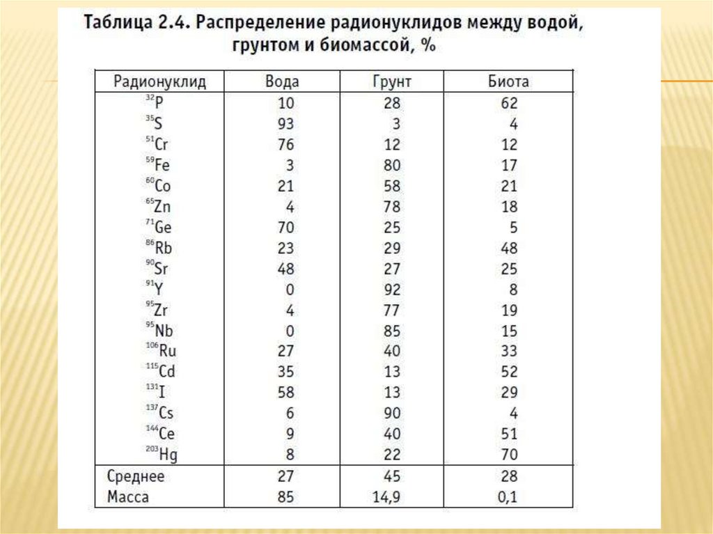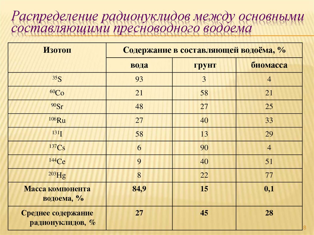 8. Распределение радионуклидов между основными составляющими пресноводного водоема