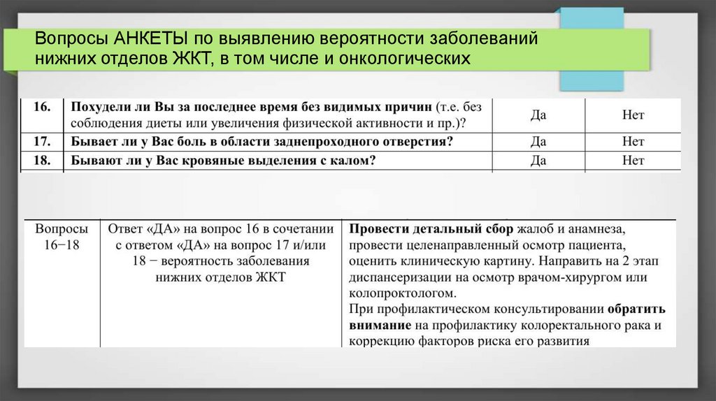 Вопросы АНКЕТЫ по выявлению вероятности заболеванийнижних отделов ЖКТ, в том числе и онкологических