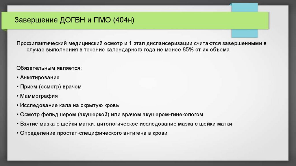Завершение ДОГВН и ПМО (404н)Профилактический медицинский осмотр и 1 этап диспансеризации считаются завершенными в