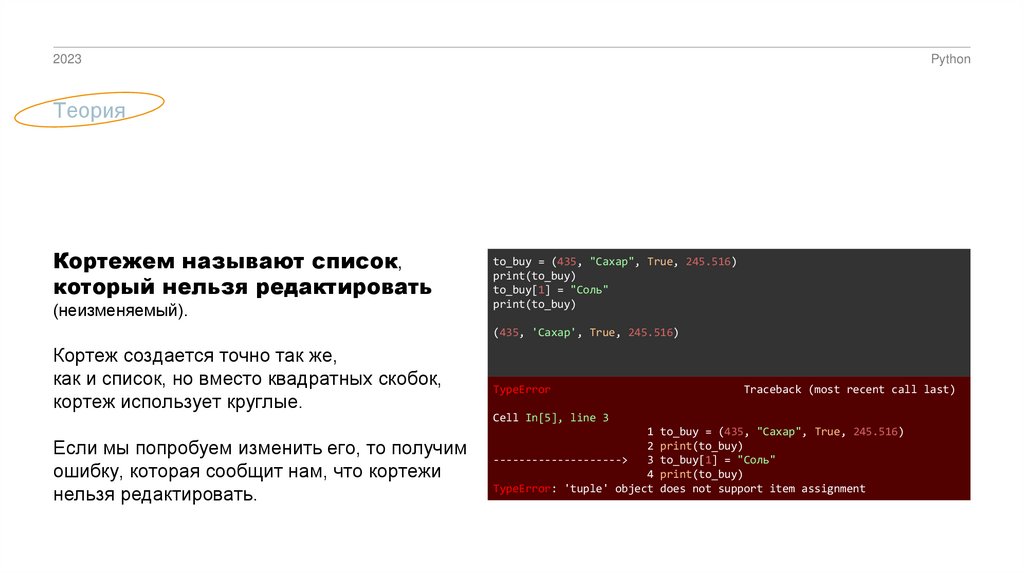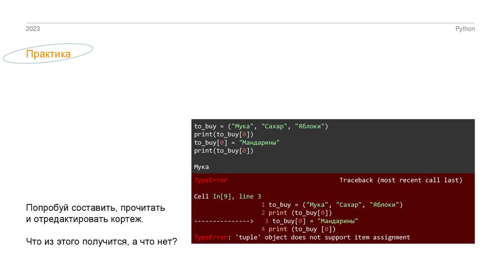 1 to_buy = ("Мука", "Сахар", "Яблоки")