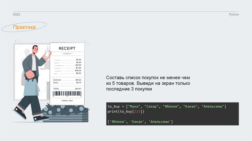 to_buy = ["Мука", "Сахар", "Яблоки", "Какао", "Апельсины"]