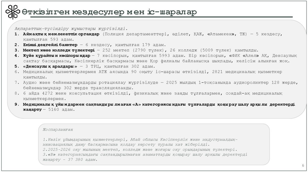 6. Медициналық қызметкерлермен АТЖ аясында 90 оқыту іс-шарасы өткізілді, 2821 медициналық қызметкер