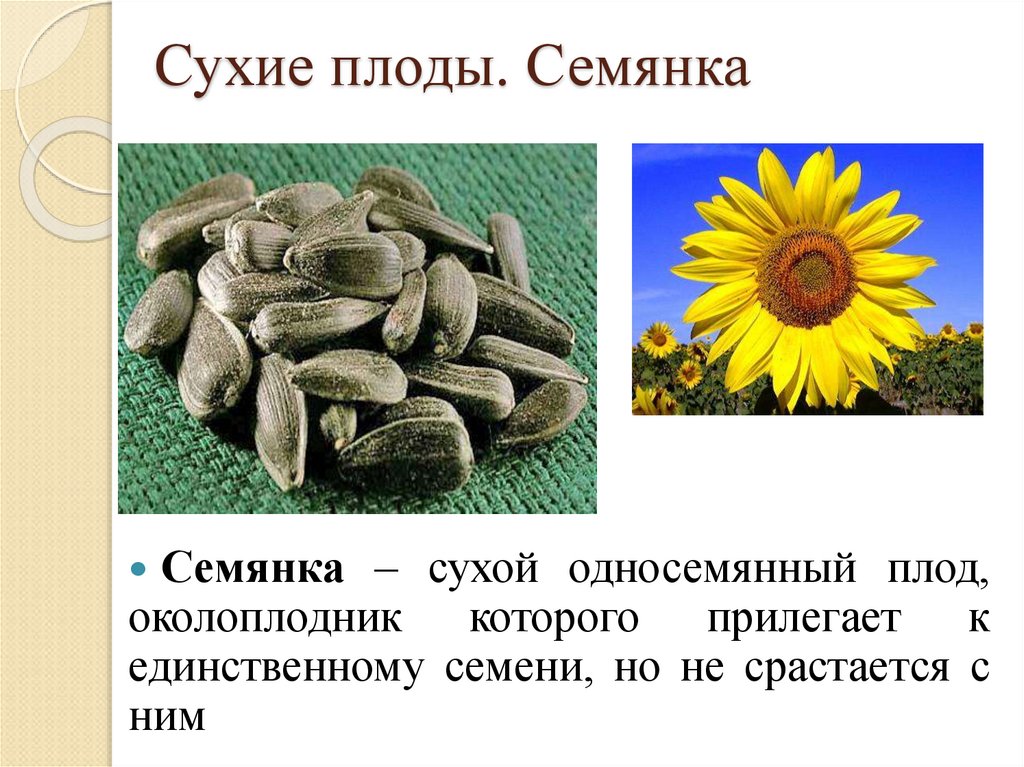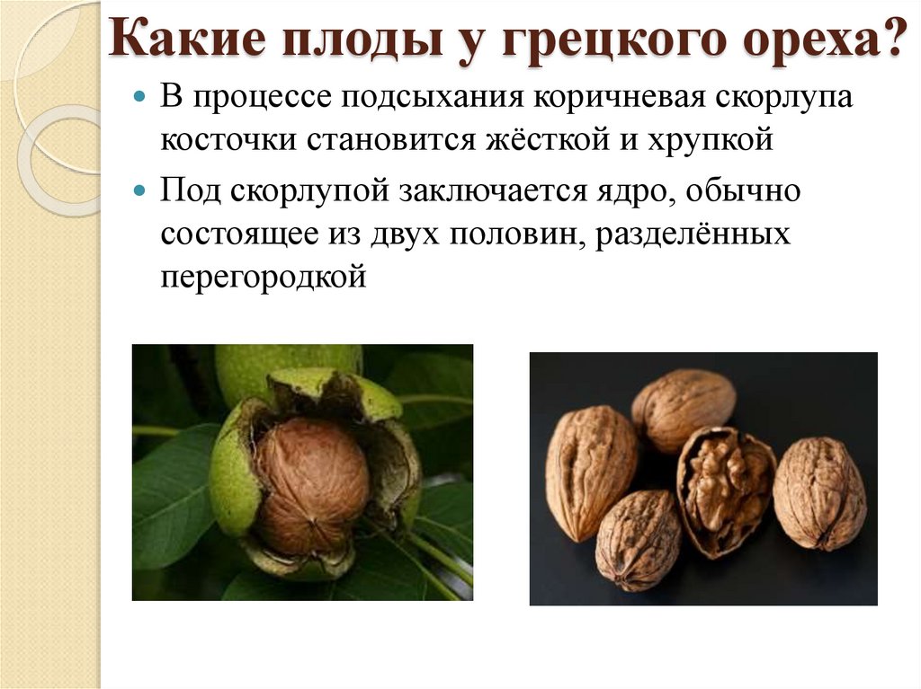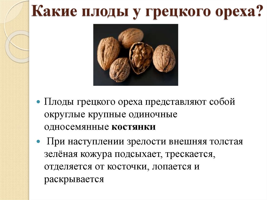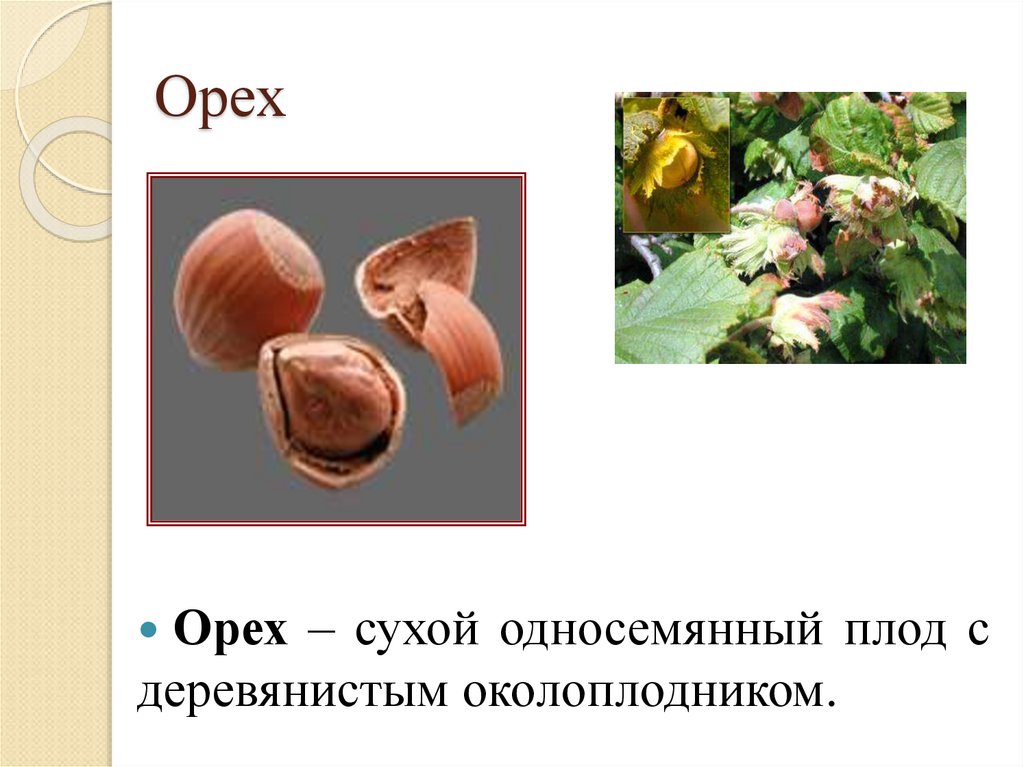 Орех – сухой односемянный плод сдеревянистым околоплодником.